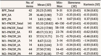 Table 1 presents the descriptive statistics of the scores obtained on the PACOF and the BPF. The skewness and kurtosis values were low; thus, parametric tests were performed to test the correlation between the scores on the different scales and sub-scales.