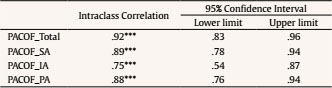 The ICC was significant for all the variables. The ICC values for the different sub-scales ranged from .75 to .89. For the PACOF total score, the ICC value was .92. The values indicate that the total PACOF scores and the sub-scale scores at both assessment points showed high stability over time (ICC = .75), supporting the reliability of the scores.