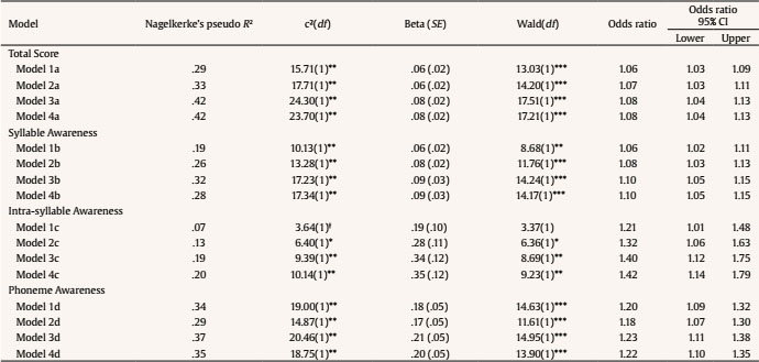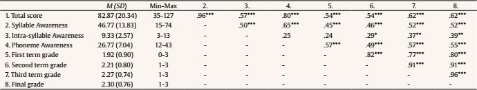 First, descriptive statistics and correlation coefficients between sub-scales were calculated. Ordinal regression analyses were performed using the PLUM procedure with a logit link function. Children´s grades in Portuguese in the first year of primary school (first term, second term, third term, and final grades) were considered dependent variables and the PACOF results (total and Syllable, Intra-syllable, and Phoneme Awareness sub-scale scores) were considered predictors.