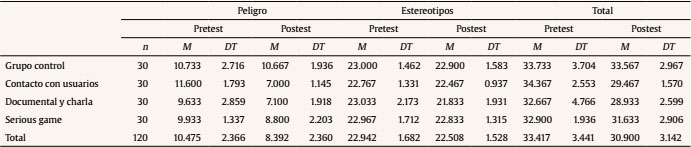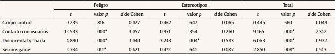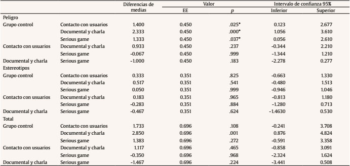 Through an analysis of covariance of the two moments, the results of the posttest (two dimensions and general score) were compared, controlling the effect of the pretest, of the three interventions against the control group. The significant differences (with important effect) in the danger dimension, in the stereotypes dimension, and in the global score are confirmed. After pairing the groups, in the post hoc tests, there are significant differences in the danger dimension in the decrease in stigma in the three interventions compared to the control group. No significant differences were found in the stereotypes dimension. In the general score, with respect to the control group, there are differences in the intervention based on the documentary and the presentation.