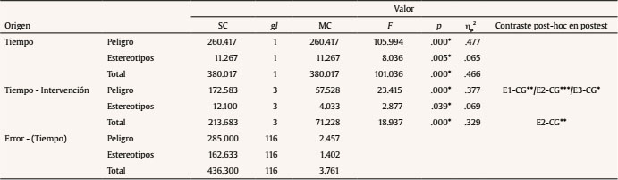Como se puede observar, existen valores estadísticamente significativos, con un tamaño del efecto elevado en todos los casos (d > 0.5) en las tres intervenciones pero no en el grupo control, lo que determina un efecto positivo de los tratamientos. Por ello, como análisis complementario, mediante un análisis de covarianza de los dos momentos se compararon las tres intervenciones con el grupo control en las puntuaciones del postest de las dos dimensiones y la puntuación general, controlando el efecto del pretest. Se presentan en la Tabla 3 la prueba de análisis de varianza de ambos momentos entre los grupos donde se ratifican las diferencias significativas, con efecto importante, tanto en la dimensión peligro, F(3, 116) = 23.415, p = .000, p2 < .377, y la dimensión estereotipos, F(3, 116) = 2.877, p = .039, p2 < .069, como en la puntuación global, F(3, 116) = 18.937, p = .000, p2 < .329.