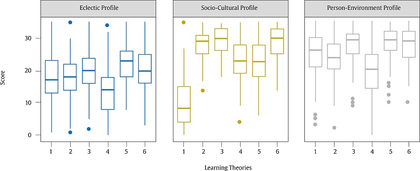 After examining the item-profile plots, the three-profile solution was deemed optimal given the ALMR likelihood ratio test, satisfactory entropy, sample sizes within profiles, and meaningful and interpretable belief-related profiles. The average posterior classification probabilities were high for eclectic profile (.934, n = 129), socio-cultural profile (.896, n = 85), and person-environment profile (.871, n = 105), indicating small classification uncertainty and that the profiles were distinguishable from one another. Generally speaking, participants classified within the eclectic profile had similar scores in all theories, except for the nativist theory, where they showed low scores. Compared to the other profiles, the eclectic profile showed lower scores in all theories except for the behaviorist theory; in this regard, the socio-cultural profile was primarily characterized by low scores in the behaviorist theory. Finally, the person-environment profile showed higher scores on psycholinguistic and behaviorist theories compared to the other profiles. Boxplots of each belief profile are presented in Figure 1.