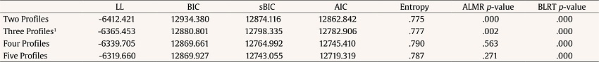 One to five latent profile models were assessed. Table 1 shows their fit indices and likelihood ratio tests. The BLRT was considered uninformative as its value was significant for each model analyzed (i.e., there were always significant differences between k-1 and k class models). The ALMR likelihood ratio test revealed that the three-profile model significantly improved the data fit compared to the two - profile solution (p < .01). Non-significant differences were found between the three and four-profile solutions and between the four and five-profile solutions. Although the AIC, BIC, and sBIC comparative fit indices successively decreased with increasing latent classes, some of the profiles in four and five-profile solutions had a very small sample size, with some profiles accounting for less than 7% of the population in the four-profile model and 5% in the five-profile.