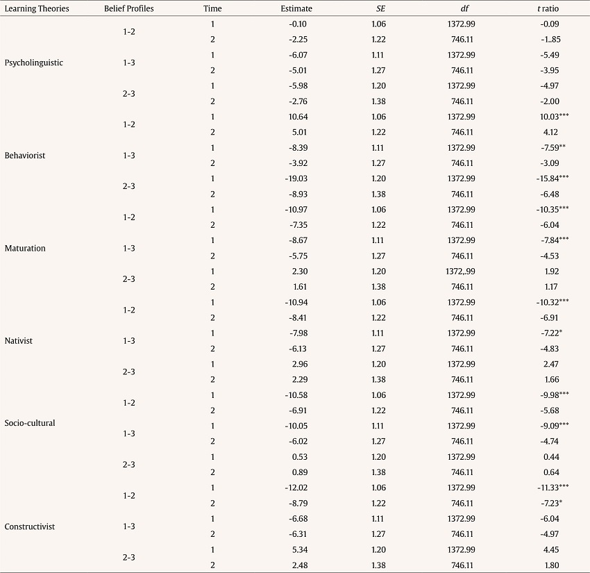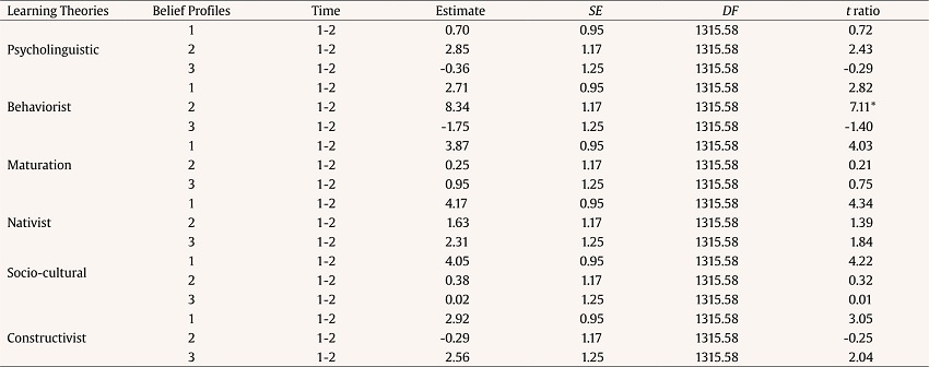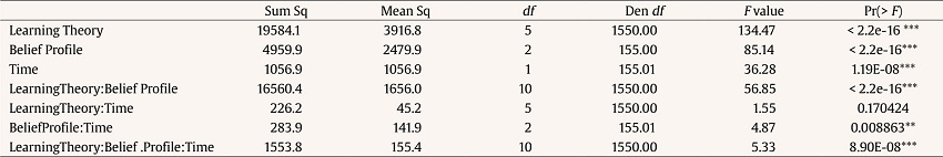 To answer the second research question (i.e., “Do belief profiles reveal different changes in attribution levels in each learning theory after the WBT?”) a linear mixed-effects model was conducted. The steps taken were as follows: (1) fixed effects terms included a triple interaction between belief profile (i.e., eclectic profile, socio-cultural profile, person-environment profile), time (i.e., pre-test and post-test), and learning theory (i.e., behaviorist, constructivist, psycholinguistic, maturation, socio-cultural theory, and nativist). Participant was included as a random effect with time as a random slope to allow the growth rate to vary randomly across participants (Finch et al., 2019); (2) in order to test for the significance of the factors, we performed a sequential decomposition of the contributions of the fixed-effects using the ANOVA function from the ImerTest package (Kuznetsova et al., 2017), using type III hypothesis test; for each factor, an F test and its corresponding p value were estimated using the Satterthwaite’s method; (3) the highest order significant interaction was followed up with pairwise post hoc tests applying the Scheffe method to adjust p values for multiple comparisons.