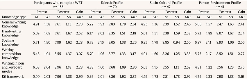 Influential research established that beliefs are associated with knowledge acquisition by filtering the interpretation of new information (Pajares, 1992). The challenging relationship between knowledge and beliefs has been addressed based on the differences between both elements. The former has been characterized by their subjective and affective character and are based on personal experiences (Pajares, 1992; Richardson, 1996); the latter has been characterized by its objective nature, which explains why they are widely accepted and do not depend on the individual itself (Rodrigo et al., 1993). Beyond the definition of both concepts, their joint approach is interesting since it is the nature of their relationship that explains teaching practices (Pajares, 1992). To our knowledge, this is the first time that belief profiles have been considered a prerequisite when measuring the effects of a WBT on PTs’ belief and knowledge changes for writing instruction.