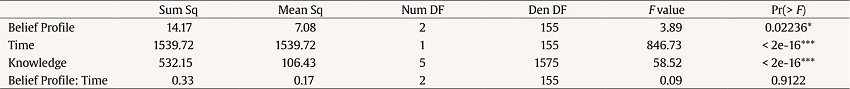 Table 4 shows means, standard deviations, and score gain of participants who completed the full WBT for the six-knowledge type. A linear mixed effect model predicting change in knowledge type by beliefs profiles after the WBT was conducted. The mixed-effects model yields a positive and significant effect of time (p < .000), meaning that the overall difference in content knowledge was significant prior and after the WBT. Last, it was also found a significant effect of the belief profile (p = .02), meaning that there were significant differences between the three beliefs profiles in the overall content knowledge. It should be noted that the interaction of the belief profile x time did not reveal significant differences (p = .91), meaning that the overall difference between the profiles did not increase after the WBT (see Table 5).