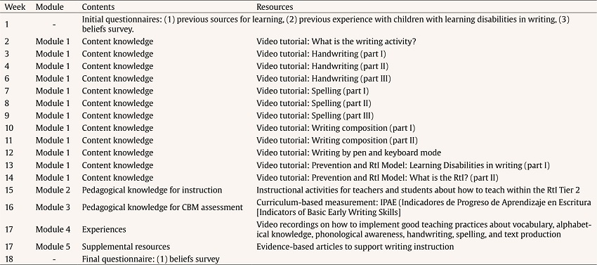 Trazo is a web-based program http://trazo.iaas.ull.es/ designed to offer digital education about writing instruction to teach typical beginner writers and beginners who struggle with writing acquisition. The multimedia design represents a virtual environment where the user sees different modules to create different spaces in the same e-learning environment containing all the necessary content and resources for teacher training. The content on the platform relies on the theoretical framework of triangular writing models (Berninger, 2000; Berninger & Winn, 2006). The first module is divided into asynchronous instructional videos (screencasts and animation-action footage) that provide step-by-step content knowledge (see the Appendix A for specific content knowledge provided). The second module contains teaching materials for teachers and students. The third volume focuses on teacher training in the IPAE (Indicadores de Progreso de Aprendizaje en Escritura [Indicators of Basic Early Writing Skills]; Jiménez & Gil, 2019) a curriculum-based measurement (CBM). In the fourth volume video, recordings are presented on how to implement good teaching practices, and in the last section, supplemental resources to support instruction are included.