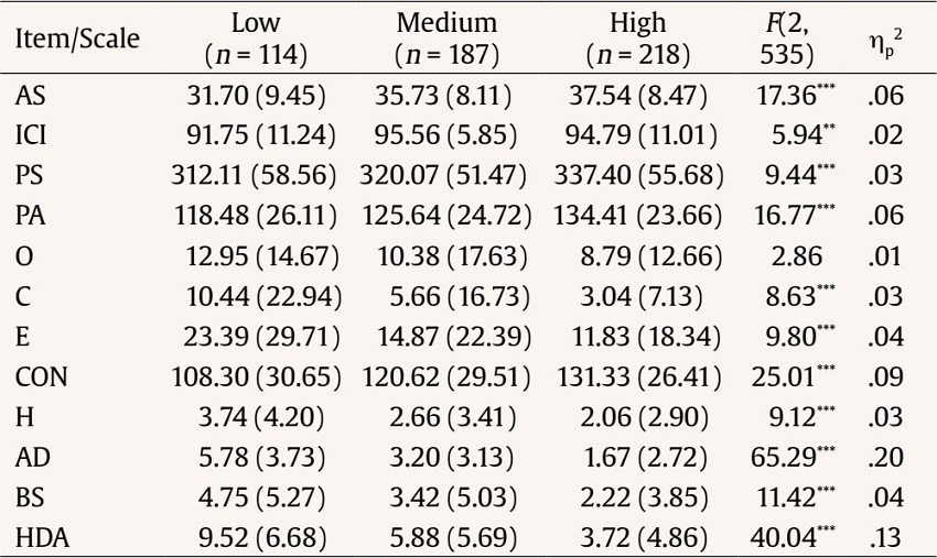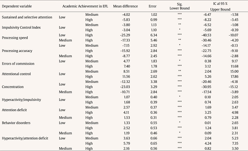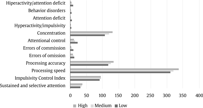 The Bonferroni post hoc test was applied to learn which pairings of the EFL achievement groups showed significant differences. The results, as seen in Table 3, reflect such differences between the low achievement group and the medium and high groups in all variables, and between the medium and high achievement groups in processing speed, processing accuracy, concentration, attention deficit, behavior disorders, and hyperactivity-attention deficit (Figure 1).