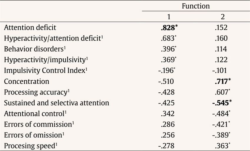 The two functions identified are interpreted in the same way as a factor analysis. The structure matrix shown in Table 4 shows the variables that enter in each discriminant function and the correlations within the groups that combine the variables and the standardized canonical discriminant functions. The variables are ordered within each function according to absolute size, noting the greatest absolute correlation between each variable and any discriminant function. A total of three variables are entered, the rest being eliminated; greater predictive weight of attention deficit can be observed in the group with low EFL academic performance, as is also seen in the variables of sustained and selective attention and concentration in the group with high academic performance.