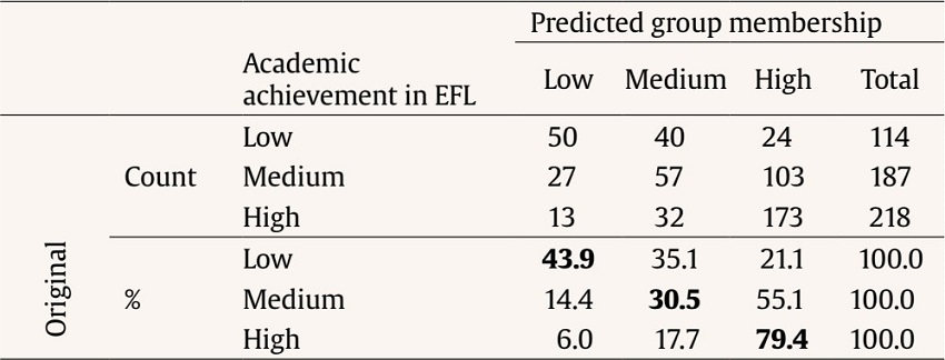 Finally, Table 5 presents the results of the classification for identifying group membership, in which 53.9% of the total cases were correctly classified, considering the original groups. In the diagonal of the upper part of the table we can observe the students (n = 280) whose group membership was predicted in agreement with where they actually appear according to their scores in the predictive variables. The lower part shows the percentages of the levels (low, medium, and high) of EFL academic performance, with 43.9% corresponding to the group of students with low EFL performance, and a higher percentage, 79.4% to the group with high performance.