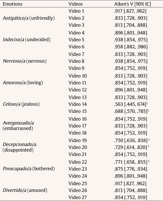 A backward translation was performed with the aim of generating a certain level of equivalence between the original and the translated version. In addition, modifications were made to adapt linguistic styles of the local context in which it was applied. The results of the study of judges (N = 12) indicated that, although most of the V coefficients exceed the critical value of .70, corresponding to the lower limit of the confidence interval, items (videos) 14, 15, 19, 20, and 22 did not meet this criterion (see Table 1). Regarding the formal aspects of the test, all met the critical value of the lower limit of the confidence interval: instruction difficulty (V coefficient = .813 [.704, .888]), appropriate number of videos (V coefficient = .958 [.882, .986]), and appropriate video quality (V coefficient = .813 [.704, .888]).
