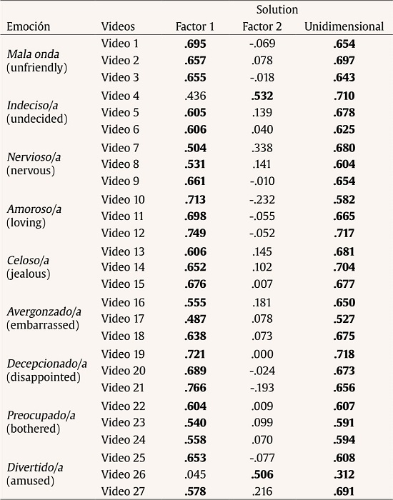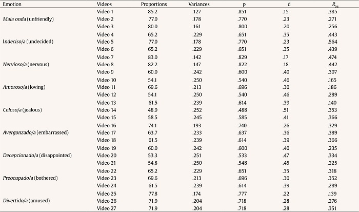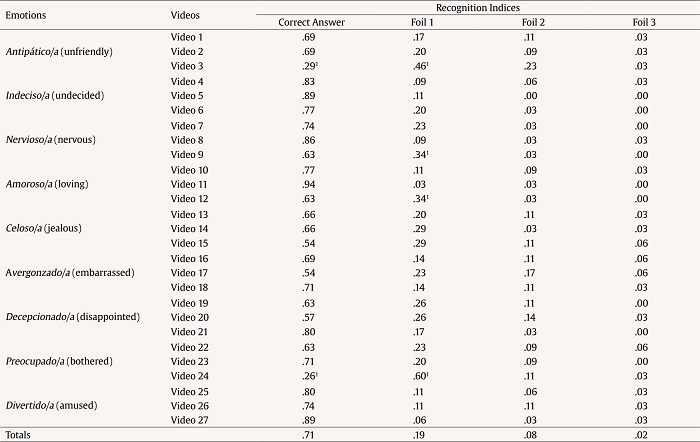 As can be seen, videos 3, 9, 12, and 24 did not meet the inclusion criteria indicated in the original test, so foil greater than .33 were replaced by others. In video 3, the foil used was disgustada (.46) and was replaced by aburrida; in video 9, the foil used was irritada (.34) and was replaced by enojada; in video 12, the foil used was esperanzada (.34) and was replaced by educada; and in video 24, the foil used was desconfiado (.34) and was replaced by furioso. The change was made by searching for an alternative term among those already present in the different exercises of the test, which would not generate confusion with the correct option, but which would retain a similar emotional valence (positive vs. negative).