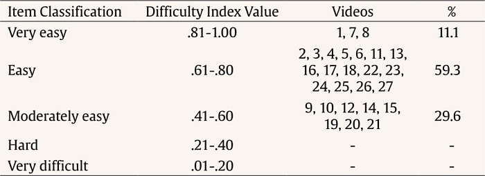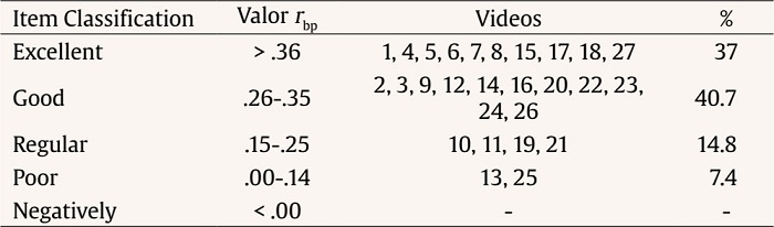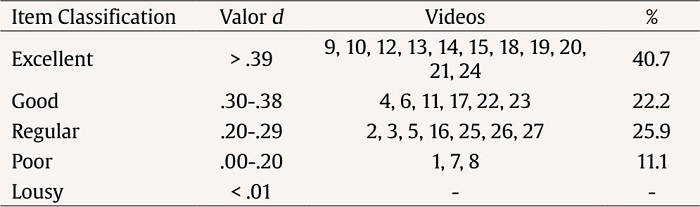 Regarding the distribution of the results of the biserial point correlation (rbp), the largest number of videos presented excellent (37%) and good (40.7%) discriminative power. Then, some videos presented a regular (14.8%) and poor (7.4%) discriminative power (see Table 6). Based on the results presented and considering the preliminary characteristics of the study, it was decided that videos should be retained despite their ease and low discriminating power.