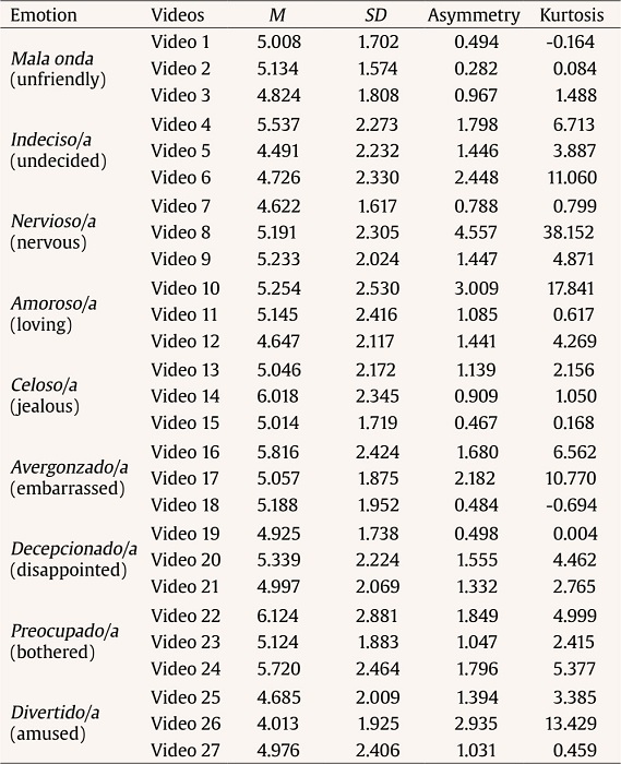 Regarding the contributions and opinions requested from the participants to improve the format and content of the items and investigate the effectiveness of the emotional stimuli, it was observed that the participants did not understand the term antipático/a [unfriendly]. Therefore, it was replaced by mala onda, a term taken from participants’ suggestions.