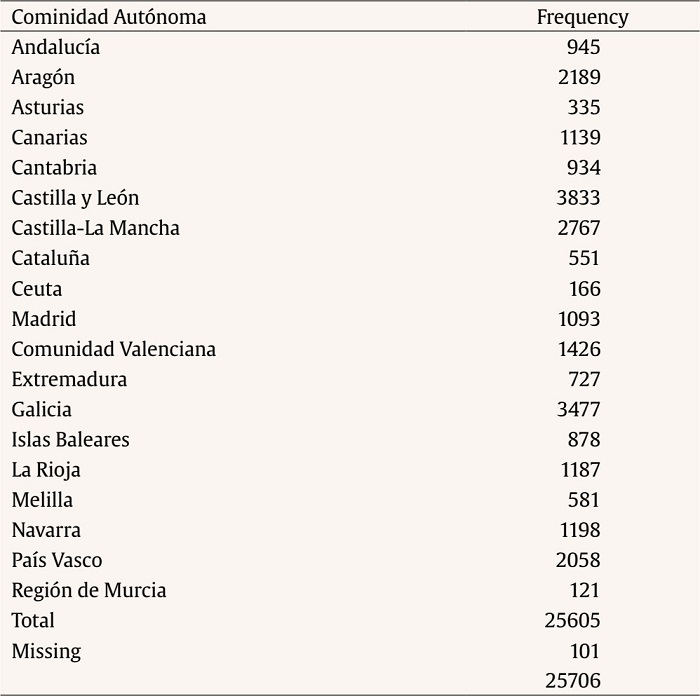 The sample consisted of 25,935 students in the Compulsory Secondary Education (ESO) stage from all over Spain, coming from public educational centers in different academic years (ESO 1st year = 6,627, ESO 2nd year = 6,906, ESO 3rd year = 6,231, ESO 4th year = 6,171). Students’ age ranged from 11 to 18 years (11 years = 112, 12 years = 4,499, 13 years = 5,933, 14 years = 6,054, 15 years = 5,958, 16 years = 2,356, 17 years = 906, 18 years = 117), although students aged 11 and 18 were subsequently removed from the study because they were a very small number of participants. Finally, 25,706 students made up the final sample, with a mean age of 13.94 years (SD = 1.39), where 48.1% of the participants were boys and 51.9% were girls (see Table 1 for the distribution by autonomous communities). The Large Universes formula (Rodríguez-Osuna, 1991) was used to calculate sampling error (see Table 2). The data was collected prior to the COVID-19 pandemic.