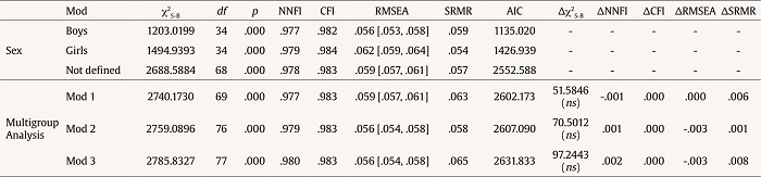Next, in order to test the degree of invariance by sex of the participants, the delta (Δ) differences among the adjustment indicators (NNFI, CFI, and SRMR) were considered. According to Dimitrov (2010), the literature suggests a change of .01 as a cut-off point to accept the hypothesis of invariance between groups.