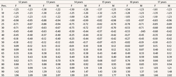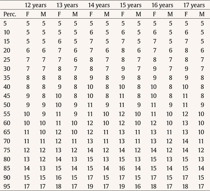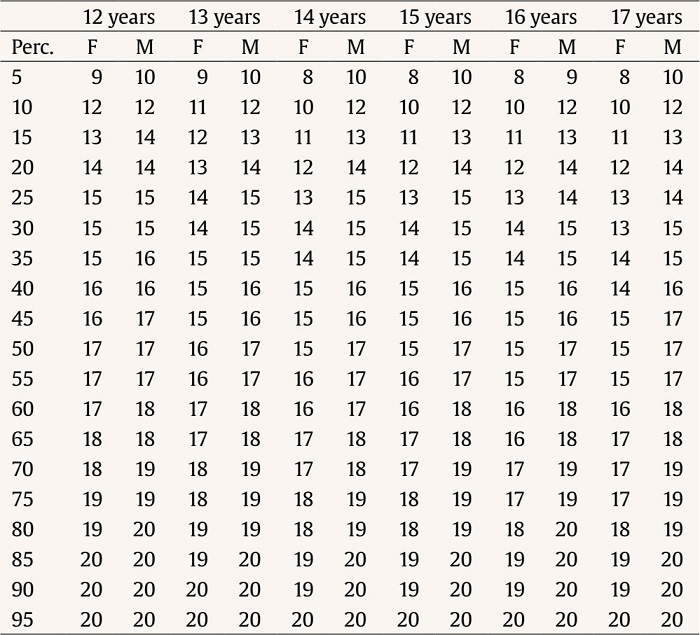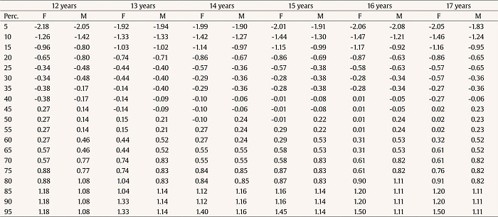 Tables 4-5 present the results of the percentiles for each dimension by age and sex of the non-standardized scores, and, on the other hand, the percentiles of the Z scores for these same percentiles studied are presented in Tables 6-7.