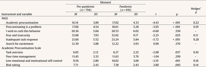 Nevertheless, we did find a lower score in procrastination due to risk taking, similar to what occurs with the search for excitement (both dimensions are indicators of intentional procrastination) in the sample of students surveyed during the pandemic. It should be remembered that those who deliberately delay a task are able to make full use of the deadline so as to respond adequately to the task (Wolters et al., 2017). However, the type of teaching to which they were accustomed had to change because of the pandemic, which may have meant that, because they were faced with a totally alien situation, they were not able to calculate the exact amount of time required.
