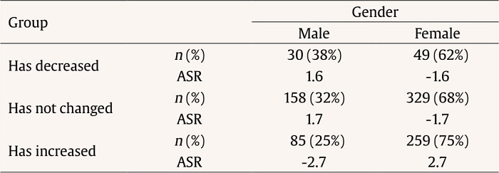 Thirty-eight percent of participants believe that the COVID-19 pandemic increased their postponing of activities, whereas 9% managed to reduce this behavior. The remaining 53% perceived no changes. This distribution is not uniform if we take gender into account (Table 3), with proportionally more women feeling that they increased such behavior, with a small effect size.