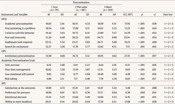 There are also differences in the search for excitement, or risk taking, and which are indicators of active procrastination. This has also been seen to be higher amongst those who feel they have increased task postponement (da Silva et al., 2020), yet without being successful, since they are less tolerant of pressure, fail to meet deadlines and, as a result, do not feel satisfied with the outcomes (Fernie et al., 2017), which would point to unsuccessful intentional procrastinating behavior.