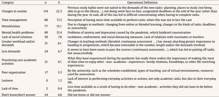 Having established the categories (Table 5), the most common are the failure to adapt pre-pandemic routines and habits (22.3%), and inadequate time management (17.2%), as a result of believing they had more time than they needed, which was not the case. Demotivation is another reason (15.1%), and is triggered by the changes in the course teaching method, added to which are the mental health problems brought on by the pandemic (13.4%), such as anxiety, depression, and so on. Another reason is the loss of social relations (7.6%), the increased workload, or the demands of the course (6.1%), although the feeling that the course is easier to pass (4.7%) means that they end up failing to devote sufficient time to actually passing it. Finally, worthy of note is the shift in priorities expressed by some students (4.1%), where the pandemic led them to reflect on the importance of other life activities beyond those of an academic nature.