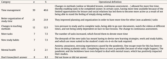 As regards the categories of reasons (Table 6), the most noticeable by far is optimal time management (40.6%), which allows them to be freer, and even to curb the feeling of inactivity, thereby promoting better organization of their studies (21.9%), favoring new learning strategies (12.5%), such that they see the situation as an opportunity to improve. For others, however, this was driven by the increased workload (7.3%), which led them to refocus their learning strategies (7.3%), so as to be more certain of success.