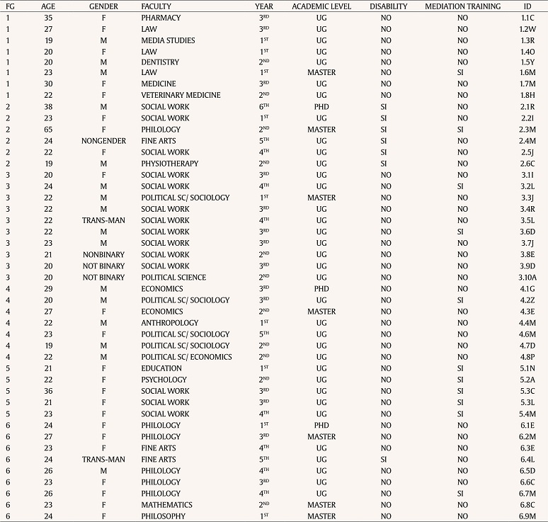 - Also, six focus groups were held to explore experiences in an interactive environment (Hamui-Sutton & Varela-Ruiz, 2013). This collectivist research approach allows for discourse enrichment through the contributions of group members. Before the focus groups, a facilitator’s guide was designed to focus on the following topics: coping strategies, academic satisfaction, gender, disability, and mediation training. Open-ended questions facilitated the discussion about potentially relevant aspects related to the analysed variable dimensions (Gundumogula, 2020).