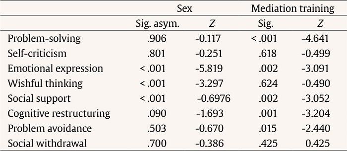 The results obtained through the Mann-Whitney non-parametric test indicate significant differences in the use of emotional expression, wishful thinking, and social support strategies based on gender. The results obtained for the average ranks indicate that women use these strategies more frequently than men. Under the same statistical parameter, the results show that having received mediation training maintains statistical significance with the use of problem-solving, emotional expression, social support, cognitive restructuring, and problem-avoidance strategies. The average ranks could indicate that individuals who have received mediation training use problem-solving, emotional expression, social support, and cognitive restructuring strategies more frequently, while those who have not received such a training use the problem-avoidance strategy more frequently (Table 3).