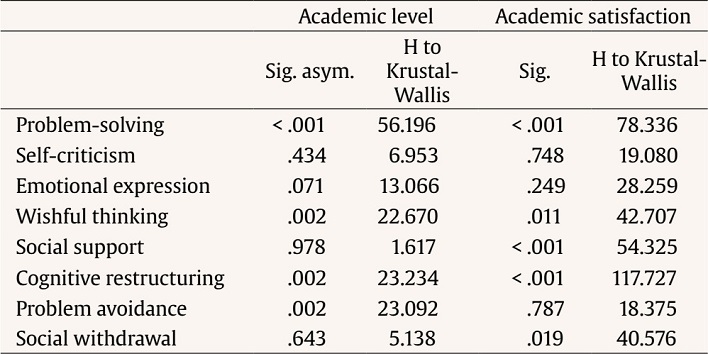 The results obtained in the Kruskal-Wallis non-parametric test, used to analyse whether there are relevant differences between academic level variables and academic satisfaction regarding the eight coping strategies, indicate significant differences based on the academic level in which students are enrolled and the use of problem-solving, wishful thinking, cognitive restructuring, and problem avoidance strategies. In this regard, the average ranks obtained in the analysis show that doctoral and master’s students use more frequently problem-solving, wishful thinking, and cognitive restructuring strategies, while undergraduate students in their first year tend to use problem avoidance more frequently. Regarding academic satisfaction, the results obtained through Kruskal-Wallis indicate differences in the use of problem-solving, wishful thinking, social support, cognitive restructuring, and social withdrawal strategies. The average ranks show that students with a better perception of their academic satisfaction (ranking above 18 out of 24 points) use problem-solving, social support, and cognitive restructuring strategies more frequently, while students who perceive lower levels of academic satisfaction (ranking below 12 out of 24 points) have a tendency to use wishful thinking and social withdrawal strategies more frequently (Table 4).