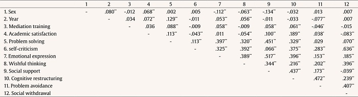 Regarding the variable of having received training in mediation, the results show a significant correlation at the bilateral .01 level with the dimensions of problem-solving, emotional expression, social support, and cognitive restructuring. In addition, the same variable presents a significant correlation at the bilateral .05 level with the problem-avoidance dimension.