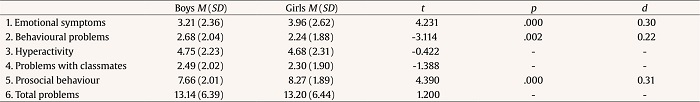 Regarding sex, significant differences were found in three dimensions of SDQ. In terms of emotional symptoms, t(802) = 4.231, p < .01, girls obtained higher scores (Table 1). The effect size of these differences was moderate (d = 0.30). On the other hand, boys presented higher scores in behavioural problems, t(802) = -3.114, p < .01. The effect size of these differences was small (d = 0.22). Lastly, girls showed the highest scores in prosocial behaviours, t(802) = 4.390, p < .01. The effect size of these differences was moderate (d = 0.31).