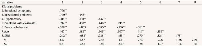As can be observed in Table 2, age was positively and significantly related to total problems (r = .167, p < .01) and to each of the problems (emotional symptoms, r = .138, p < .01; behavioural problems, r = .142, p < .01; hyperactivity, r = .097, p < .01; and problems with classmates, r = .114, p < .01). The older the age of the participants, the greater the problems they presented. Prosocial behaviours was negatively and significantly correlated with age (r = -.186, p < .01). Therefore, the older the age of the participants, the lower their prosocial behaviours. SFRI was positively and significantly related to total problems (r = .242, p < .01) and to each of the problems (emotional symptoms, r = .82, p < .05; behavioural problems, r = .236, p < .01; hyperactivity, r = .153, p < .01; and problems with classmates, r = .270, p < .01). Thus, the greater the risk, the greater the problems presented by the participants. On the contrary, prosocial behaviours was negatively and significantly correlated with risk (r = -.324, p < .01). That is, the greater the risk, the lower the prosocial behaviours shown by the participants.