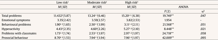 With regard to the presence of strengths and difficulties among these preadolescents and adolescents as a function of their risk level, a one-factor ANOVA was performed with its corresponding post hoc Bonferroni analysis (Table 3). Differences were found among the three groups, with significant differences and a small effect size in all domains, except in emotional symptoms. The students of the groups of higher risk presented greater moderate scores in all of the problems. Regarding prosocial behaviours, those with a higher SFRI presented lower scores, with a moderate effect size.