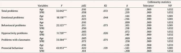All the linear regression models calculated were significant (Table 4). As is shown by the regression values, the slopes of the total problems, hyperactivity and problems with classmates increased with increasing age and SFRI. The slope of emotional problems also increased with age and was positive with the female sex. The regression equation with respect to behavioural problems was also positive and increased with the increasing age of the boys and increasing SFRI. Lastly, in relation to prosocial behaviours, the slope of the equation was negative and decreased with the increasing age of the boys and increasing SFRI.
