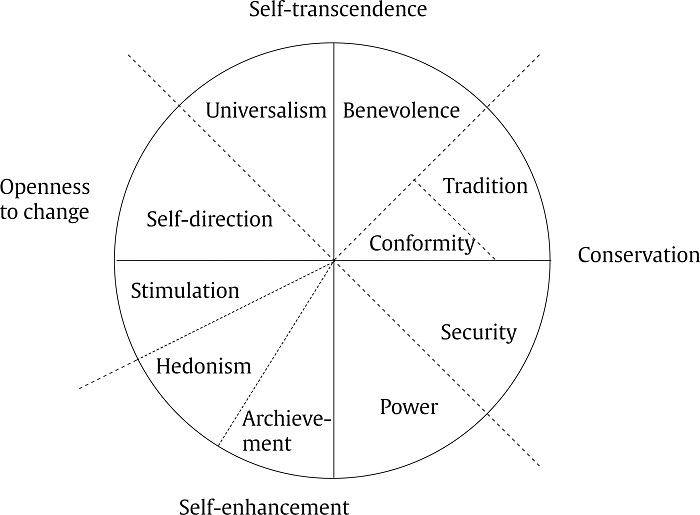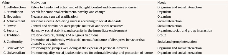 Another fundamental assumption of Schwartz’s theory is the idea that it is possible to establish 10 (ten) types of human values, thus defined in terms of the motivational goals adopted to satisfy the three needs mentioned above. The values identified by Schwartz are: 1) Self-direction, 2) Stimulation, 3) Hedonism, 4) Achievement, 5) Power, 6) Security, 7) Tradition, 8) Conformity, 9) Benevolence, and 10) Universalism. The motivating needs met by each of these values and the motivations derived from them are shown in Table 1.