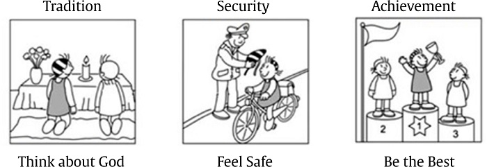 The development of the PBVS-C is based on the consideration that concrete information plays an important role in the constitution of children’s thoughts. Books, movies, and children’s toys, for example, represent vehicles through which abstract concepts such as human values are conveyed in a concrete way (Labbé & Puech, 2005). The use of images allows the formulation of instruments compatible with the child’s level of cognitive development and, therefore, maintains their interest and active participation during the investigation (Schmalt, 2005).