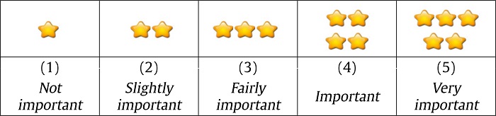 The degree of importance attributed to the value by the child was operationalized on a 5-point Likert scale (from 1 = not important at all to 5 = very important). In order to adapt the instrument to the child’s understanding, the Likert scale was also graphically represented by means of 5 cards (Figure 3) that present a number of stars corresponding to its value on the scale (e.g., “See, you can answer using these cards with little stars”).