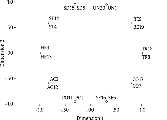The adequacy of the data obtained through the PBVS-C for the Schwartz’s (1992) theoretical model was verified through a multidimensional scaling (MDS) analysis. This technique adopts measures of intercorrelation between variables as a criterion for similarity. Through MDS, each variable is represented by a point on a two-dimensional plane, so that the degree of similarity between the variables is indicated by their distance: the greater the similarity between the variables, the smaller the distance between their respective points, and the greater the dissimilarity, the greater this distance (Borg & Groenen, 2005).