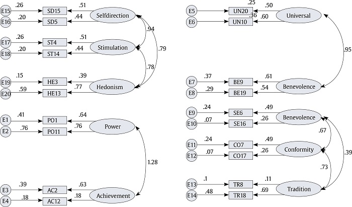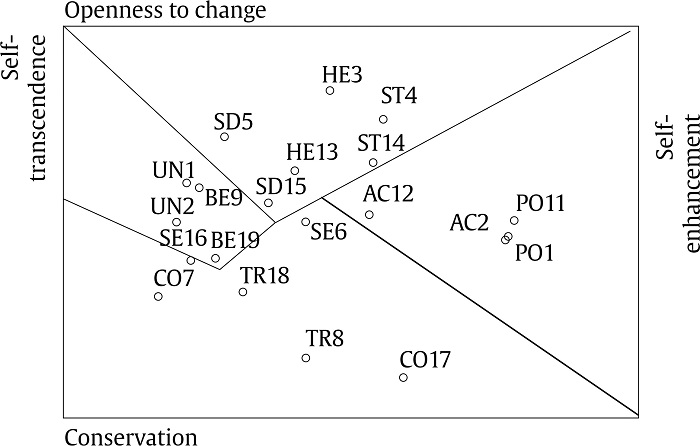 As shown in Figure 5, the dimension of Self-enhancement (α = .67) comprises the items referring to Power (PO1 + PO11) and Achievement (AC2 + AC12). Openness to change dimension (α = .62) encompasses the items Hedonism (HE3 + HE13), Self-direction (SD5 + SD15), and stimulation (ST4 + ST14). Benevolence (BE9 + BE19) and Universalism (UN1 + UN20) items are grouped in the Self-transcendence region (α = .63). Finally, the Security (SE6 + SE16), Tradition (TR8 + TR18), and Conformity (CO7 + CO17) items are found in the Conservation region (α = .45).