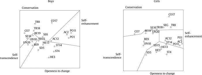 The multidimensional scaling analyses carried out according to the sex of the participants confirmed the adequacy of the structure found both among boys (Stress 1 = .172) and among girls (Stress 1 = .210). Figure 6 shows the distribution of values according to the sex of the participants.