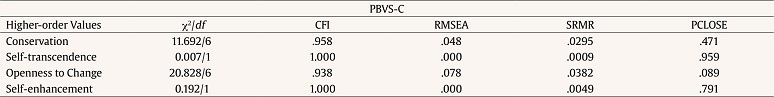 For each higher order category of values CFA models that represented the more narrowly defined values were generated. It was expected that these models would encompass the structure underlying Schwartz’s (1992) theory. Table 2 presents the model fit indexes for the four models. As shown in Table 2, all the dimensions of the PBVS-C present good global fit indices, with Self-transcendence and Self-enhancement having a better fit than Openness to change and Conservation values. However, Figure 7 shows collinearity between achievement and power values and between benevolence and universalism values.