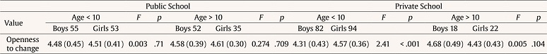 In the interaction between children’s sex and age, it was found that in private schools, among younger children (6-10 years old), girls have greater adherence to the values of Openness to change than do boys. Among older children (11-12 years of age), however, these differences do not occur. In public schools, in turn, no differences were observed in adherence to these values depending on the sex or age of the child.