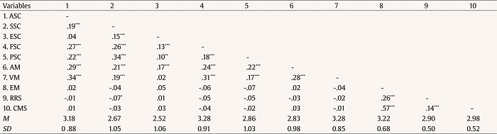 Initially, a pre-analysis was conducted by computing the means and standard deviations of each variable (Table 1). Furthermore, Table 1 presents the results of the bivariate correlation analysis between self-concept dimensions and SRL components. The findings indicate positive correlations between affective motivation and academic self-concept (r = .29, p < .001), social self-concept (r = .21, p < .001), emotional self-concept (r = .17, p < .001), family self-concept (r = .24, p < .001), and physical self-concept (r = .22, p < .001). Likewise, positive correlations were observed between value motivation and academic self-concept (r = .34, p < .001), social self-concept (r = .19, p < .001), family self-concept (r = .31, p < .001), and physical self-concept (r = .17, p < .001). However, no correlations were found between self-concept dimensions and expectancy motivation, resource regulation strategies, and cognitive and metacognitive strategies.