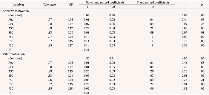 Both models obtained significant results, explaining 15% and 18% of the variance in affective motivation and value motivation, respectively (Table 2). Academic self-concept (β = .21, p < .001), social self-concept (β = .09, p < .01), emotional self-concept (β = .12, p < .001), family self-concept (β = .12, p < .001), and physical self-concept (β = .11, p < .001) emerged as positive predictors of affective motivation (Table 2). Moreover, academic self-concept (β = .26, p < .001), social self-concept (β = .07, p < .05), and family self-concept (β = .22, p < .001) were identified as significant predictors of value motivation (Table 2).