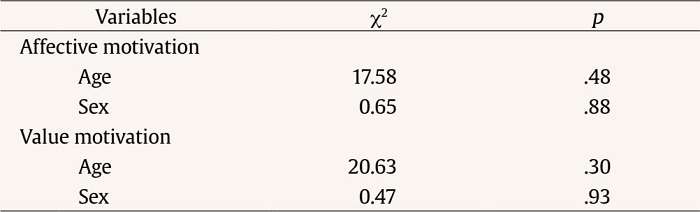 Finally, the results of the chi-square test for age and sex were not significant, indicating that these variables had no effect on affective motivation and value motivation (Table 3).