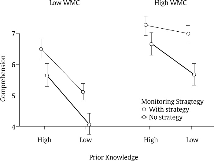 The fourth research question examined whether there are interactions between working memory capacity and the use of a monitoring strategy in the comprehension of high-knowledge and low-knowledge texts. The results from Experiment 2 indicated that, similar to prior knowledge, working memory did not significantly interact with the monitoring strategy. This finding suggests that the monitoring strategy is equally effective across different levels of working memory capacity, allowing readers to engage with and integrate textual information independently of their cognitive resources. Thus, the monitoring strategy operates as a robust tool that can enhance comprehension across a wide range of cognitive abilities.