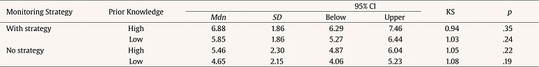 After checking the assumption of normality of the distributions, the analysis of variance was performed and detected a main effect of the monitoring strategy, F(1, 47) = 18.22, p < .001, η²p = .28, and a main effect of prior knowledge, F(1, 47) = 24.10, p < .001, η²p = .34. No interaction effect was found, F(1, 47) = 0.36, p = .55, η²p = .01.