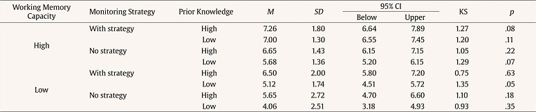 First, descriptive and distribution statistics were obtained for measures of comprehension of high and low prior knowledge expository texts, read with and without monitoring strategy, for readers with high and low working memory capacity (see Table 2 and Figure 1).