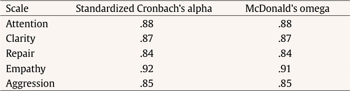 Regarding the concurrent validity, negative correlations were found between all the dimensions of the TMMS-24 and aggression. Thus, adolescents with higher perceived emotional intelligence are less aggressive. These findings are in line with a meta-analysis that found that a high level of emotional intelligence was related to lower aggression in adolescents, with several included studied that used the TMMS-24 (for a revision see Vega et al., 2021). Concurrent validity was also analyzed through the analysis of the relation between TMMS-24 and empathy. The correlations showed that, although the three dimensions of TMMS-24 were positively related to empathy, the strongest correlation was with attention. Similar results were found in previous studies, since normally young adults and adolescents with high affective empathy show high levels of emotional attention (Garaigordobil, 2020; Gómez-Leal et al., 2021; King et al., 2012).