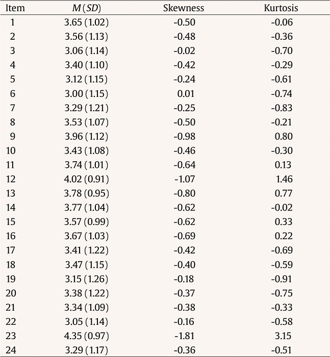Reliability statistics such as McDonald’s omegas and standardized Cronbach’s alphas were calculated with FACTOR 10 (Lorenzo-Seva & Ferrando, 2015). Descriptive statistics such as means, standard deviations, skewness, kurtosis per item and total score, and Pearson correlations (to test concurrent validity through correlations among total scores) were calculated with PASW-Statistics 18. A confirmatory factor analysis was conducted with EQS 6.2 software with maximum likelihood robust method and polychoric correlations. This method is recommended for ordinal data (i.e., items). Goodness of fit was tested according to different indices such as CFI value above .90, RMSEA below .08 and NFI above .90 (Bentler, 1990).
